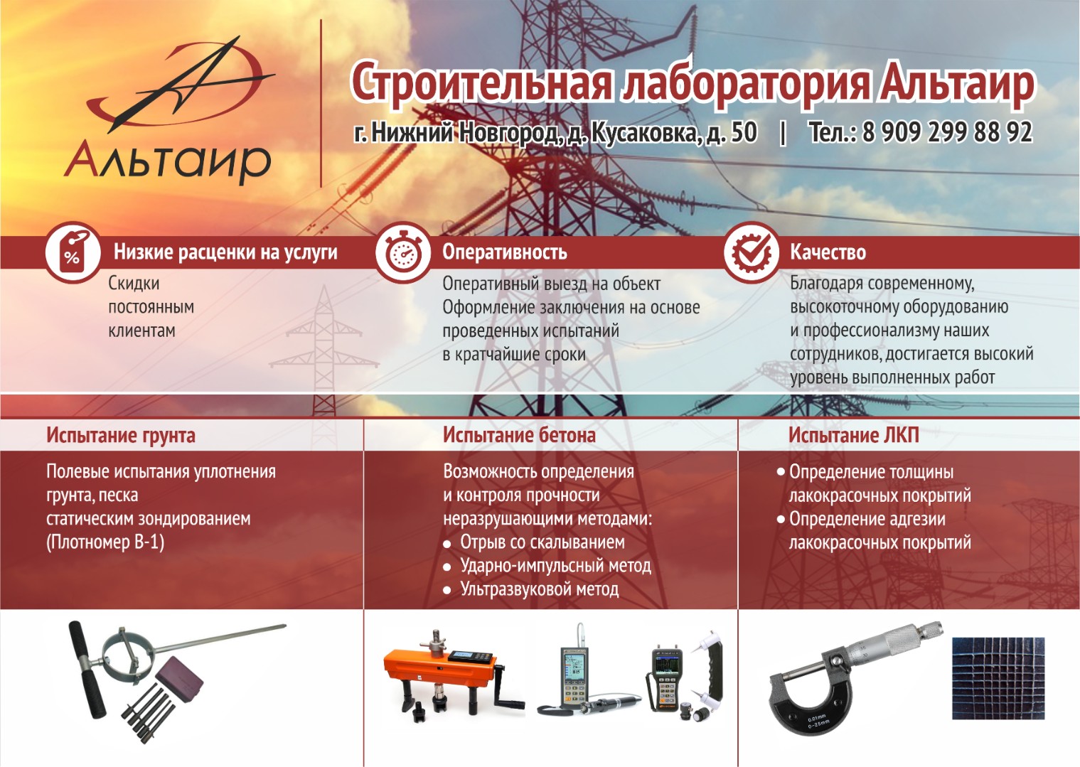 Компания «Альтаир» имеет свою собственную испытательную лабораторию, которая прошла аккредитацию и получила лицензию на проведение испытаний строительно- монтажных работ с правом выдачи протоколов испытаний.